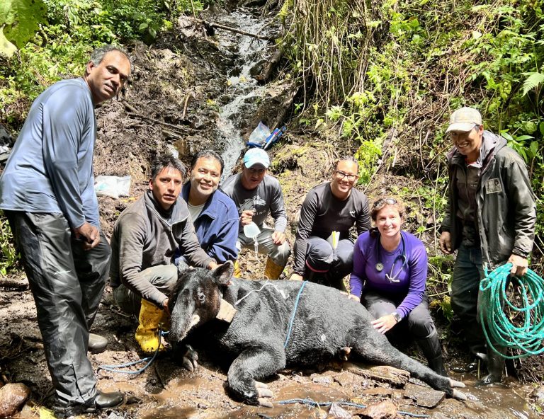 We have been collaborating with the Andean Bear Foundation, local government, zoos, and specialists from the IUCN Tapir Specialist Group since 2016, to help study and protect mountain tapir. Our current work includes field anesthesias to GPS collar and do health assessments on this elusive species, and community engagement.